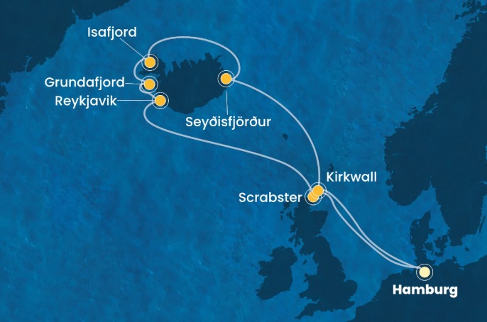 12. nap (aug.13): Megérkezés Kirkwallba a reggeli órákban, majd fakultatív program keretén belül felfedezzük Kirkwall városát. A kikötést követően kishajó segítségével érünk partot, majd séta a régi városrészben. Kirkwall az Orkney-szigetek viking fővárosa. Első állomásunk a csodálatos 12. századi vörös homokkőtömbökből épült Szent Magnus-székesegyház A házak között sétálva úgy érezzük magunkat, mintha visszaléptünk volna az időben. Sétánk Kirkwall szívében folytatódik, ahol a 12. század és később restaurált Püspöki palota romjaira bukkanunk. Az itt álló kör alalkú torony, a Mossie Toor tetejéről csodálatos kilátás nyílik a vásrosra. Megcsodálhatjuk az Earl's Palace-t is, amely egykor az Orkney-szigetek arisztokráciájának otthona volt. Pompás építészetével a francia reneszánsz építészet legszebb példája Skóciában. Kirándulásunk végén meglátogatjuk aTankerness House kerteket, amik ma az Orkney Múzeumnak adnak otthont, feltárva a szigetek történetét a kőkorszaktól napjainkig. A program végén szabadidő, majd visszatérés a hajóra, majd behajózás Hamburg felé.