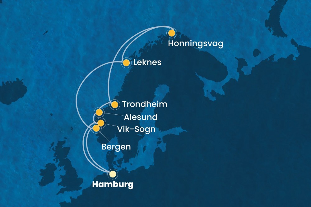 8. nap (jún. 25.): Fakultatív kirándulási lehetőség az Északi-fok felfedezésére. A Nordkapp Európa legészakibb pontja, amely évszázadok óta vonzza a világ minden tájáról érkező felfedezők generációit. Ez a Jeges-tengerrel való utolsó határvidék, és Észak-Norvégia egyik legjobb helye az sarki fény megfigyelésére. Megérkezve a Nordkapphalle-hoz, a turisztikai látogatóközponthoz, kiélvezhetjük a látványos tájat. Pihenhetünk, tarthatunk egy kávészünetet, vásárolhatunk egy kicsit, és meglátogathatjuk a bolygó legészakibb kápolnáját. Az épület legfelső emeletén egy étterem található, ahonnan hihetetlen kilátás nyílik a hegyvidékre és a végtelen óceánra. Ezen kívül elbűvöl az a film, amely négy évszakon keresztül kalauzol el minket ebben a kontrasztokkal, látványos fényekkel és lélegzetelállító tájakkal teli tájban, mindezt magával ragadó filmzenével. A filmet a világ első 180°-os vásznán vetítik. A fakultatív program után visszatérés a hajóra, behajózás Trondheim felé.